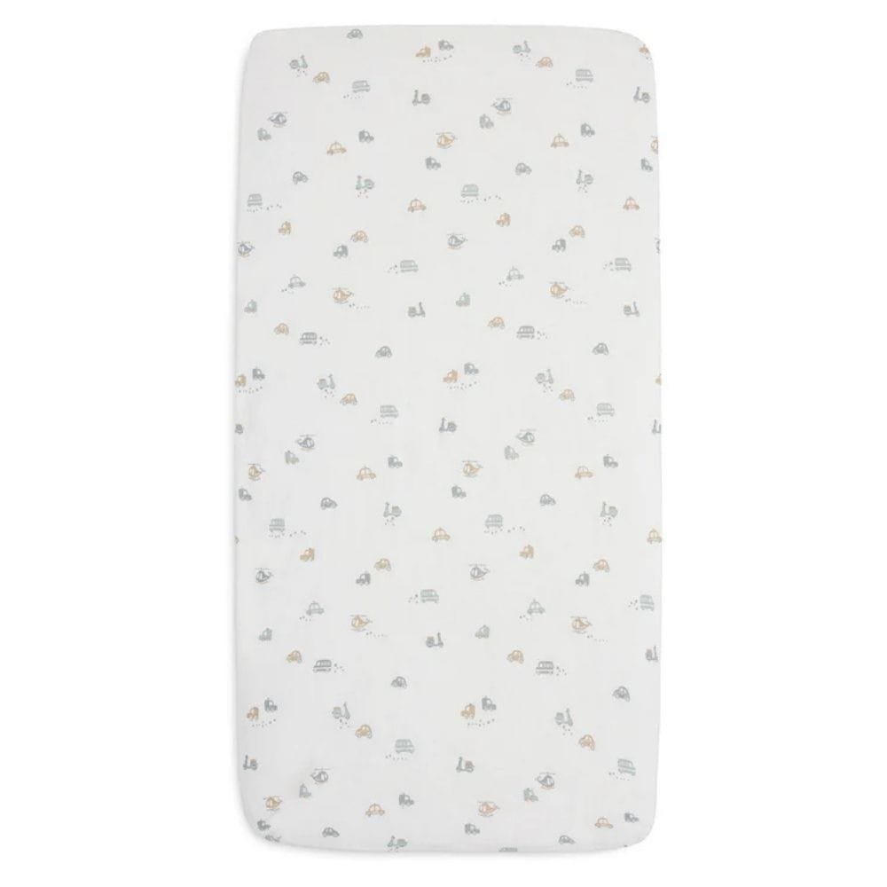 Κρατήστε το στρώμα του μικρού σας ασφαλές και άνετο με αυτό το χαριτωμένο σεντόνι με λάστιχο. Το σεντόνι έχει ένα γλυκό, ολόκληρο σχέδιο με αυτοκίνητα, πατίνια και ελικόπτερα σε φόντο εκρού (Ivory). Το σεντόνι εφαρμόζει εύκολα γύρω από το στρώμα χάρη στα λάστιχα σε κάθε γωνία.
