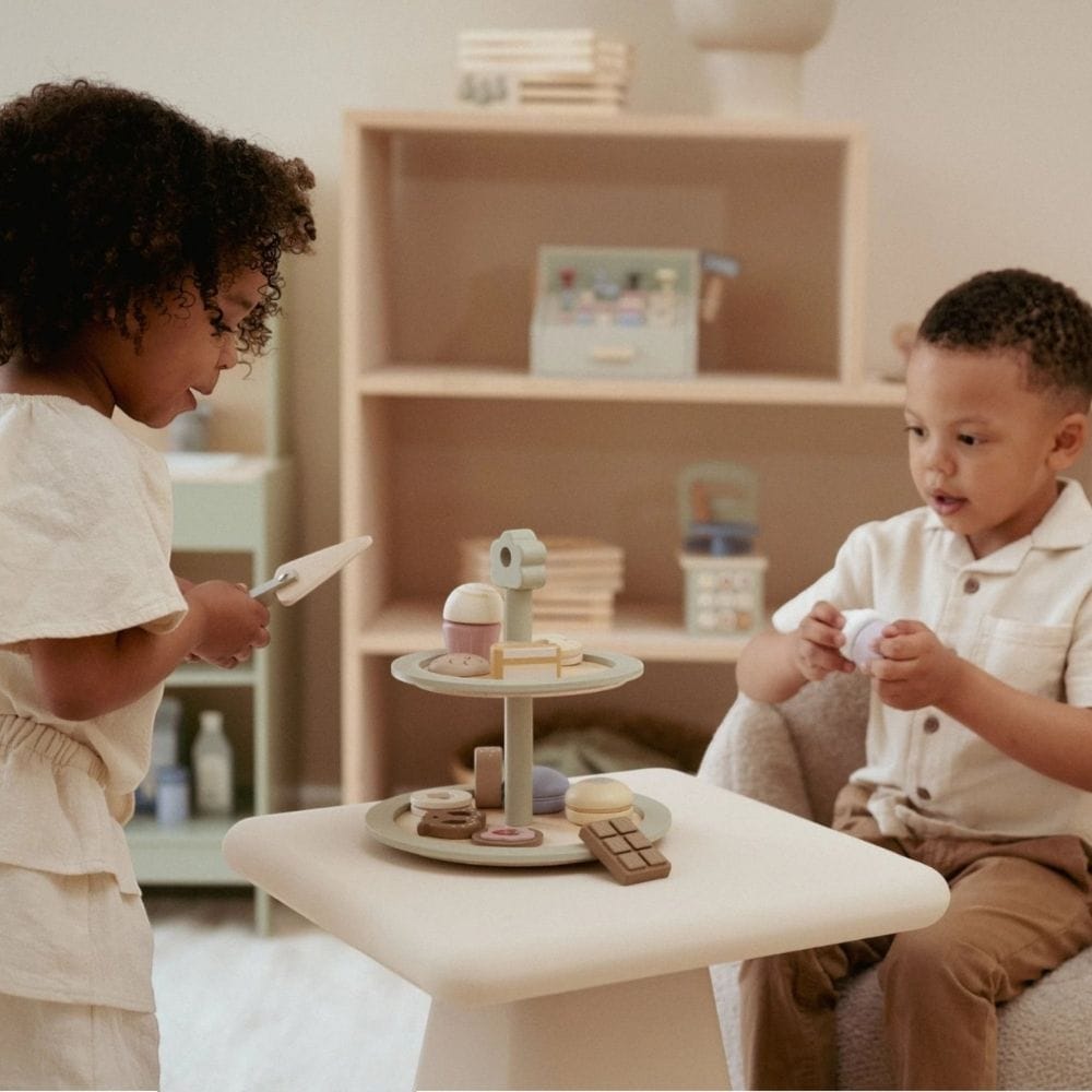Αυτή η όμορφη ξύλινη διώροφη πιατέλα είναι γεμάτη λαχταριστά γλυκά, έτοιμα για σερβίρισμα από τους μικρούς οικοδεσπότες. Στα δύο επίπεδα θα βρείτε ένα μάφιν, τραγανά μπισκότα και πολύχρωμα μακαρόν, όλα εξίσου δελεαστικά.
