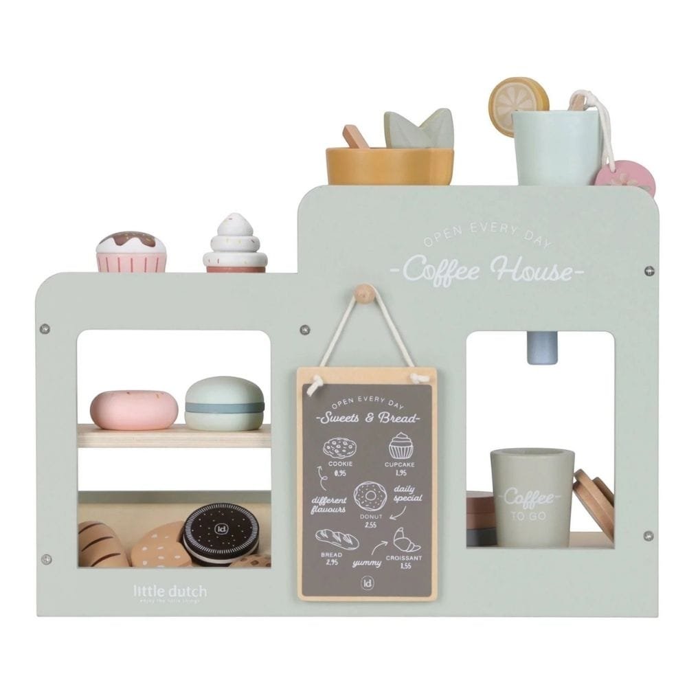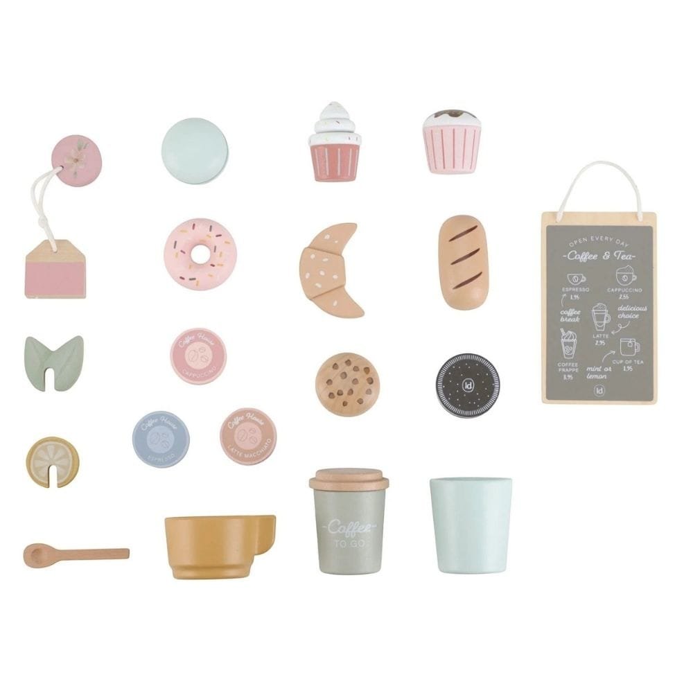 Το σετ περιλαμβάνει μηχανή καφέ και τσαγιού, αποθηκευτικό χώρο για φλιτζάνια και ντουλάπι για να εκθέτουν τα λαχταριστά σάντουιτς και γλυκάκια.