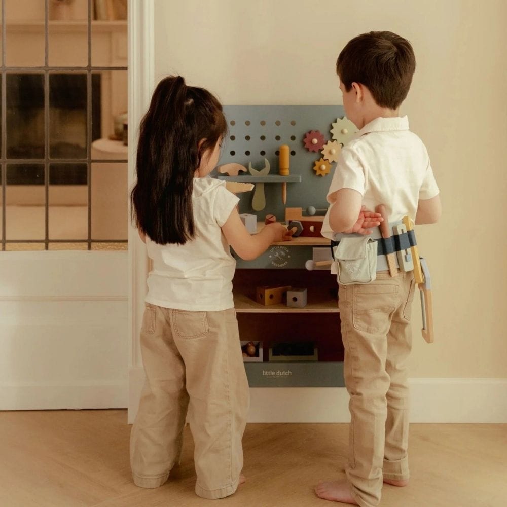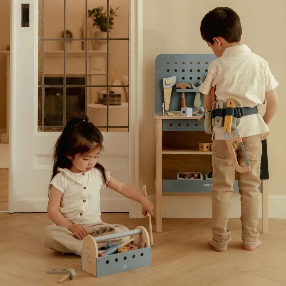 Τα νήπια λατρεύουν να αντιγράφουν τους γονείς τους και αυτός ο πάγκος εργασίας τους επιτρέπει να δημιουργούν, να φτιάχνουν και να επισκευάσουν αντικείμενα, όπως και οι ενήλικες! Μια συναρπαστική δραστηριότητα για τα παιδιά που μαθαίνουν να βιδώνουν, να πριονίζουν και να συνδέουν κομμάτια μεταξύ τους, εξασκώντας τις κινητικές τους δεξιότητες καθώς και τη φαντασία τους.