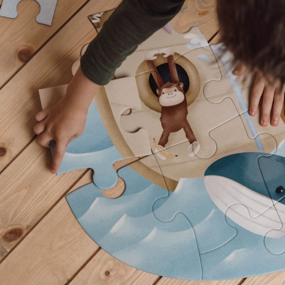 Καθίσετε στο πάτωμα και συναρμολογήσετε και τα 44 κομμάτια. Έτσι δημιουργείται μια μεγάλη απεικόνιση διαστάσεων 84 x 97,5 εκατοστά. Το λιοντάρι, ο ελέφαντας και οι άλλοι φίλοι τους ζουν διαφορετικές περιπέτειες στον ωκεανό.